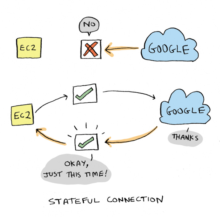 Going back to that outbound rule example. Now we can hit google.com from our server (an outbound request). But wait: the response from Google would be inbound traffic. And we have no inbound rules!